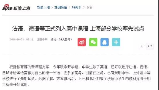 因為今年上半年有看到教育部出的一個政策,至少現(xiàn)在在拿上海作試點,把它加入了高中外語課程,他可以不選英語,只選選法語就可以。
