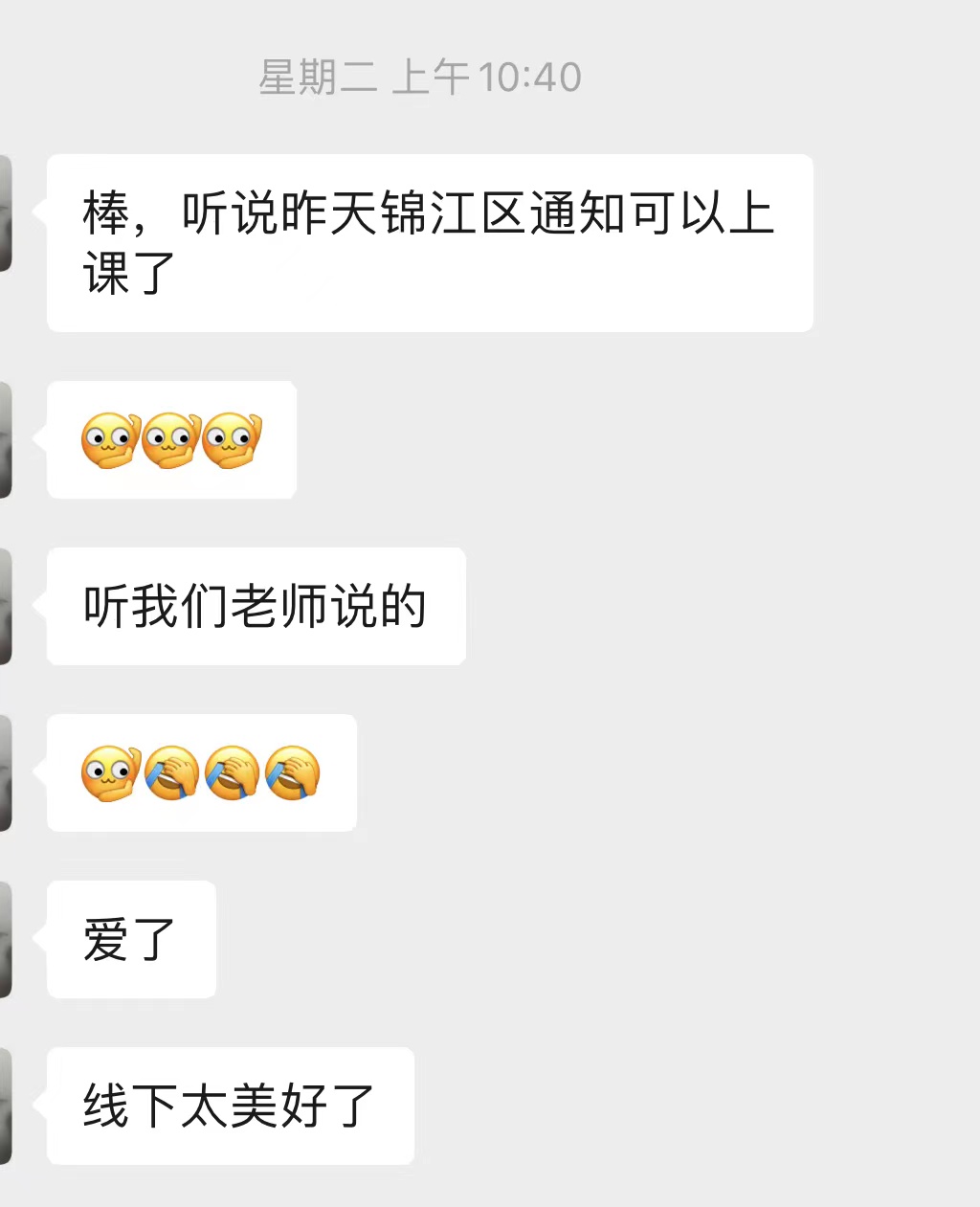 “同學(xué)們,明天我們就能到線下上課了喲~”聽(tīng)到這個(gè)消息后,同學(xué)們立馬在學(xué)習(xí)群里“炸了鍋”,開(kāi)心的心情溢于言表。(最近收到很多同學(xué)的私信,都表示想回到我們的文明課堂,也懷念線下上課時(shí),與老師同學(xué)相處的美好時(shí)光,其實(shí)老師心里覺(jué)得超感動(dòng)的啦~