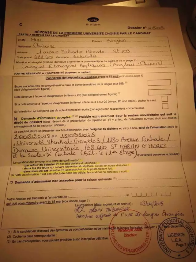 這一別都快一年了,前不久聽(tīng)說(shuō)她被格勒諾布爾第三大學(xué)(Université Stendhal)的LEA專(zhuān)業(yè)錄取,真的很替她高興,相信這是一個(gè)好的開(kāi)始,以后她會(huì)用自己的這份執(zhí)著為我們見(jiàn)證不一樣的奇跡。