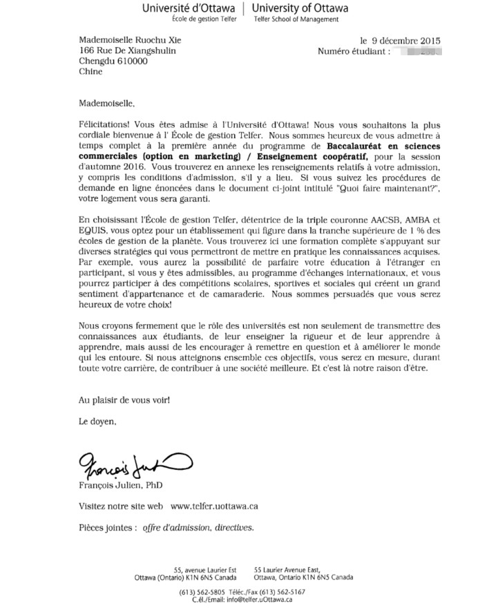 渥太華大學工商管理系的offer,簡直棒棒噠~~