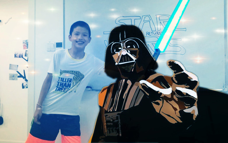 這個參演《星球大戰(zhàn)》的就是法語部黃巖琪老師班上來的新同學(xué)哈利啦。他是《星球大戰(zhàn)》的死忠粉,每次上課之前必須涂鴉一遍這個電影名,話說你們猜猜這娃今年多大了?