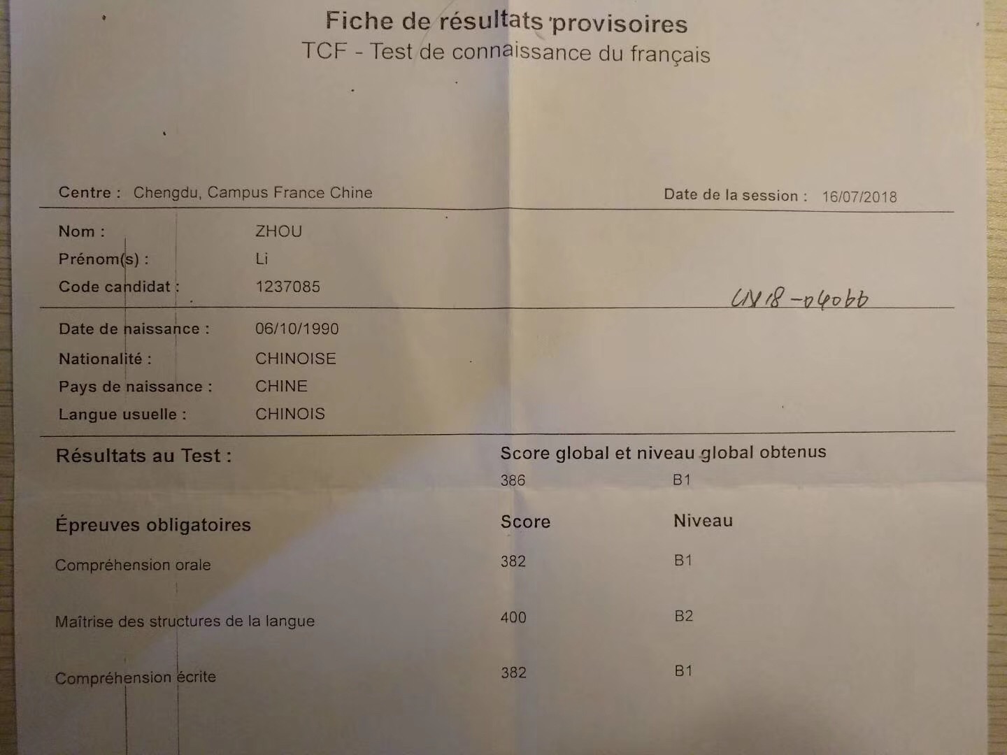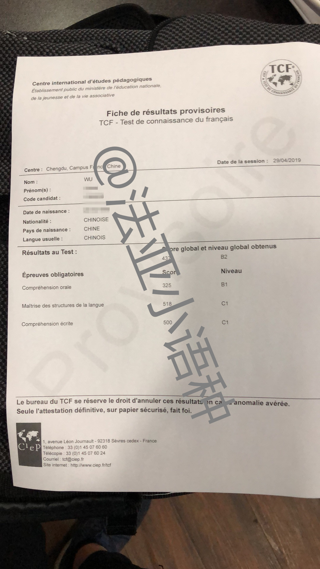 考試類型:TCF B1 所報(bào)課程:法語出國班恭喜法語王悅同學(xué)喜提t(yī)cf B1成績