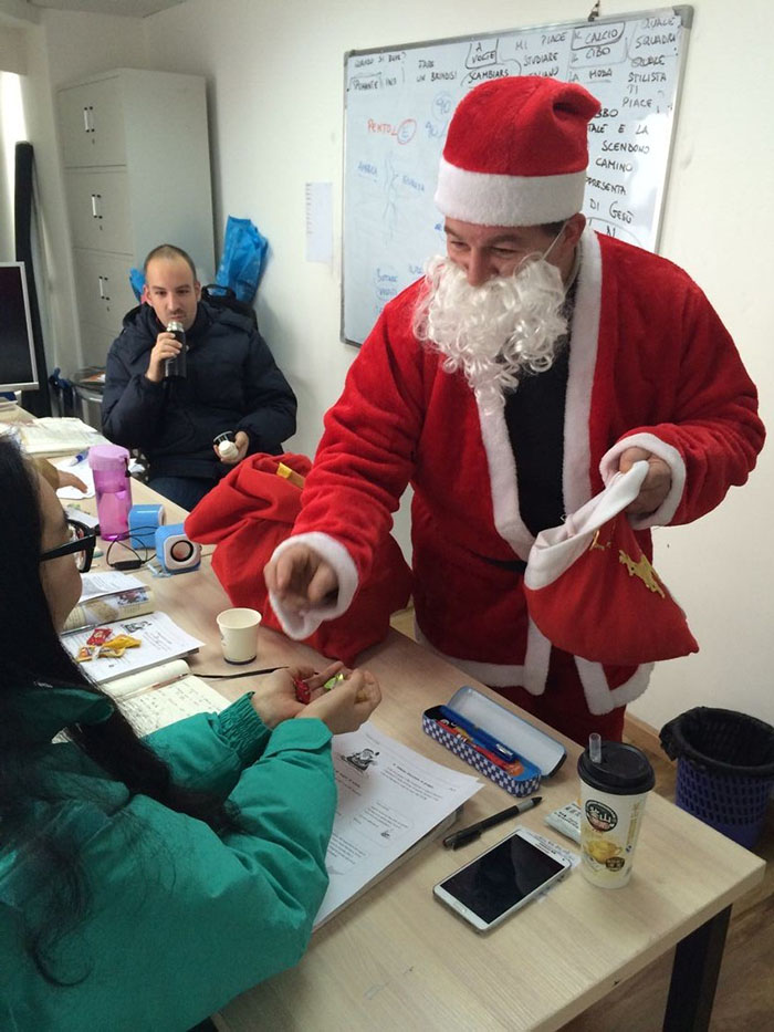 當(dāng)日早上,我校意大利籍外教老師在我校老師的共同幫助下驚喜變裝,套上紅色的圣誕老人裝,黏上白花花的大胡子,從孜孜教學(xué)的老師搖身一變成為和藹逗人的“圣誕老人”,不僅如此,“圣誕老人”還手提一個(gè)大紅袋子,里面裝滿了我校事先準(zhǔn)備好的糖果和各式各樣的小禮物,懷里還捧著一小盒許愿卡,準(zhǔn)備為同學(xué)們送上圣誕的祝福。