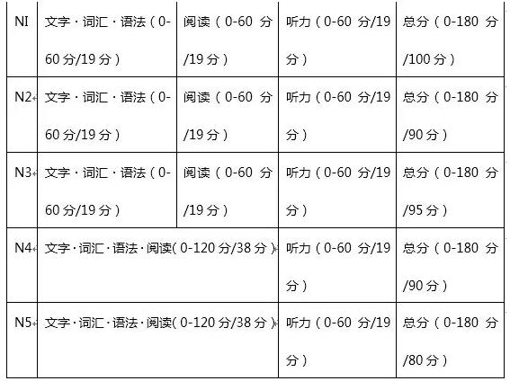 JLPT的認(rèn)定基準(zhǔn)為滿分180分,“/”后的為合格分?jǐn)?shù)。