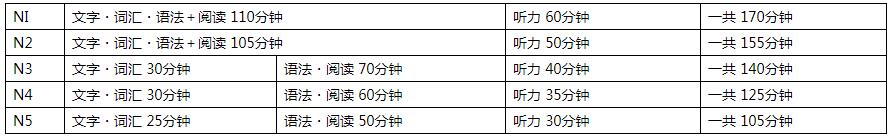 JLPT無論哪一個級別都按照“文字、詞匯、語法、閱讀”的筆試部分和“聽力”部分。文字部分主要考察音讀和訓(xùn)讀;詞匯部分考察意思、近義詞和詞性;語法部分考察語法使用、組句和文章中的語法應(yīng)用;閱讀包括短中長篇及兩篇文章的比較等;聽力主要考察有視覺信息和無視覺信息的二人會話和單人敘述。