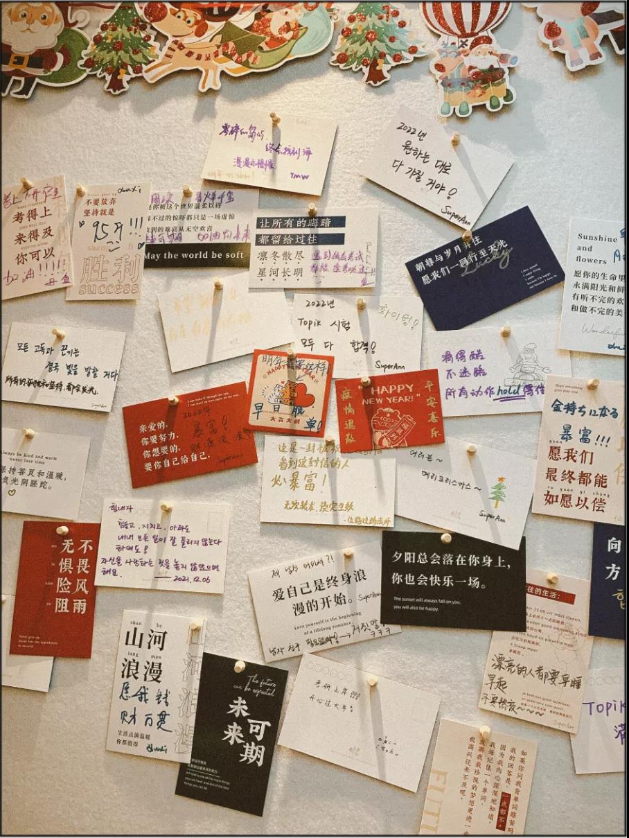 在轉角的榮譽墻中,出現(xiàn)了一面不一樣的愿望墻。校區(qū)老師們精心挑選了不重樣的賀卡,邀請往來的同學們留下你未完成,或是期待已久的心愿,帶著這些美好的期待,上墻向著嶄新的一年出發(fā)。?