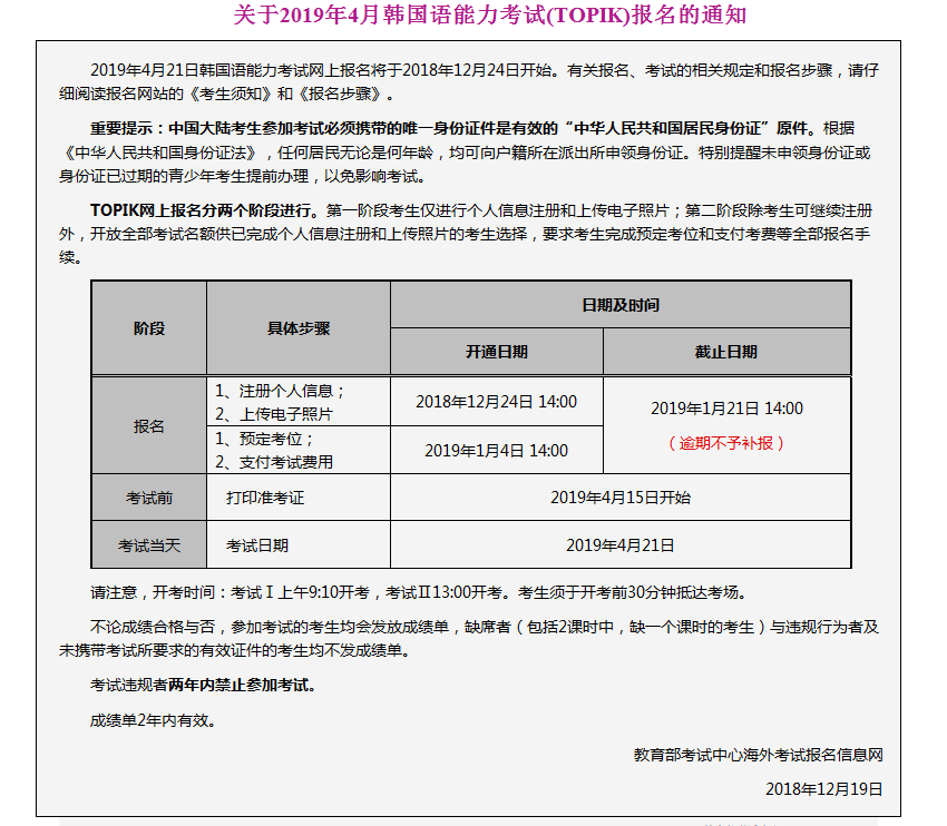 2019年4月韓國語能力考試TOPIK考試時間